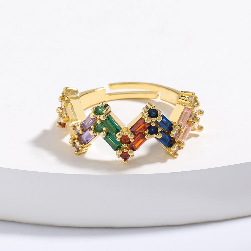 Der EMES SHOP Ring besticht durch eine Reihe bunter Strasssteine auf einem goldfarbenen Ring. Mit einem Kristall, der wie echte Diamanten glänzt, und einem Zickzack-Design verleihen diese schillernden Accessoires Ihrem eleganten Outfit den perfekten Touch.