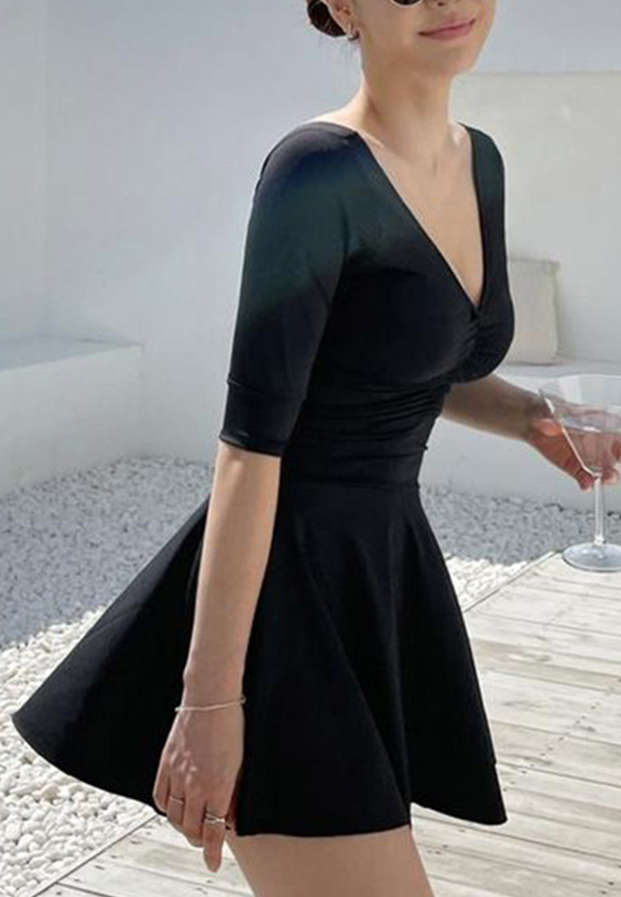 Der einteilige Badeanzug von EMES SHOP besticht durch gerüschte Brustpartie und Oberkörper, einen tiefen V-Ausschnitt, einen offenen Rückenausschnitt und figurbetonte Halbarm-Ärmel. Die Tellerrock-Silhouette macht ihn zum perfekten Badeanzug für einen tropischen Urlaub. Wenn Sie gepflegt und strandtauglich aussehen möchten, ohne im Bikini herumlaufen zu müssen.