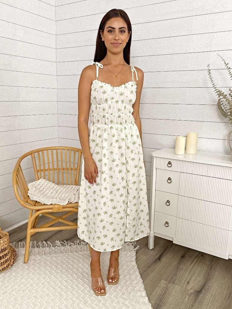 Das Kleid von Emes Shop besticht durch einen herzförmigen Ausschnitt, gerüschte Büste und Taille für einen perfekten Sitz und dünne, selbstbindende Schleifenträger. Der hohe Beinschlitz reicht bis zum Knie und die Midi-Länge reicht bis unters Knie. Dieses feminine Kleid ist perfekt für all Ihre Sommerpläne. Kombinieren Sie es mit Ihren Lieblingssandalen und einem Hut für einen eleganten Look.