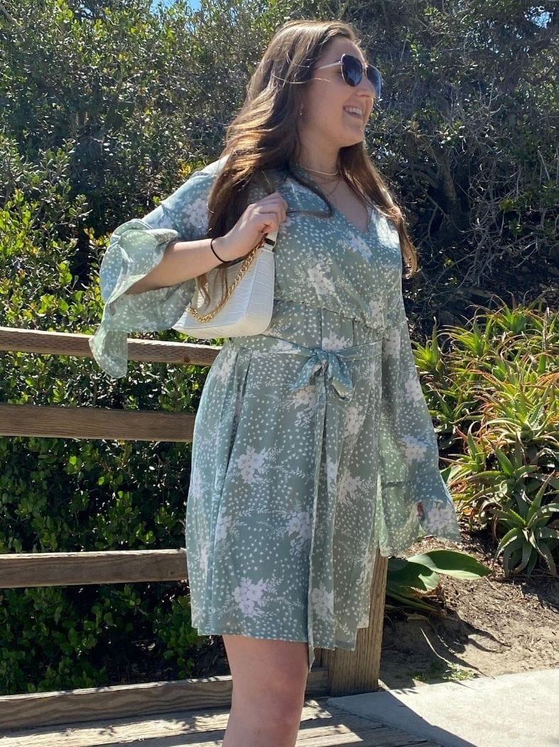Das Kleid von Emes Shop ist mit wunderschönen Blumenmustern verziert. Es hat einen Überwurf-Ausschnitt, Wickeloptik, Glockenärmel und ist über dem Knie lang. Kombinieren Sie es mit einem Sommerhut und der passenden Tasche für einen wunderschönen Sommerlook.