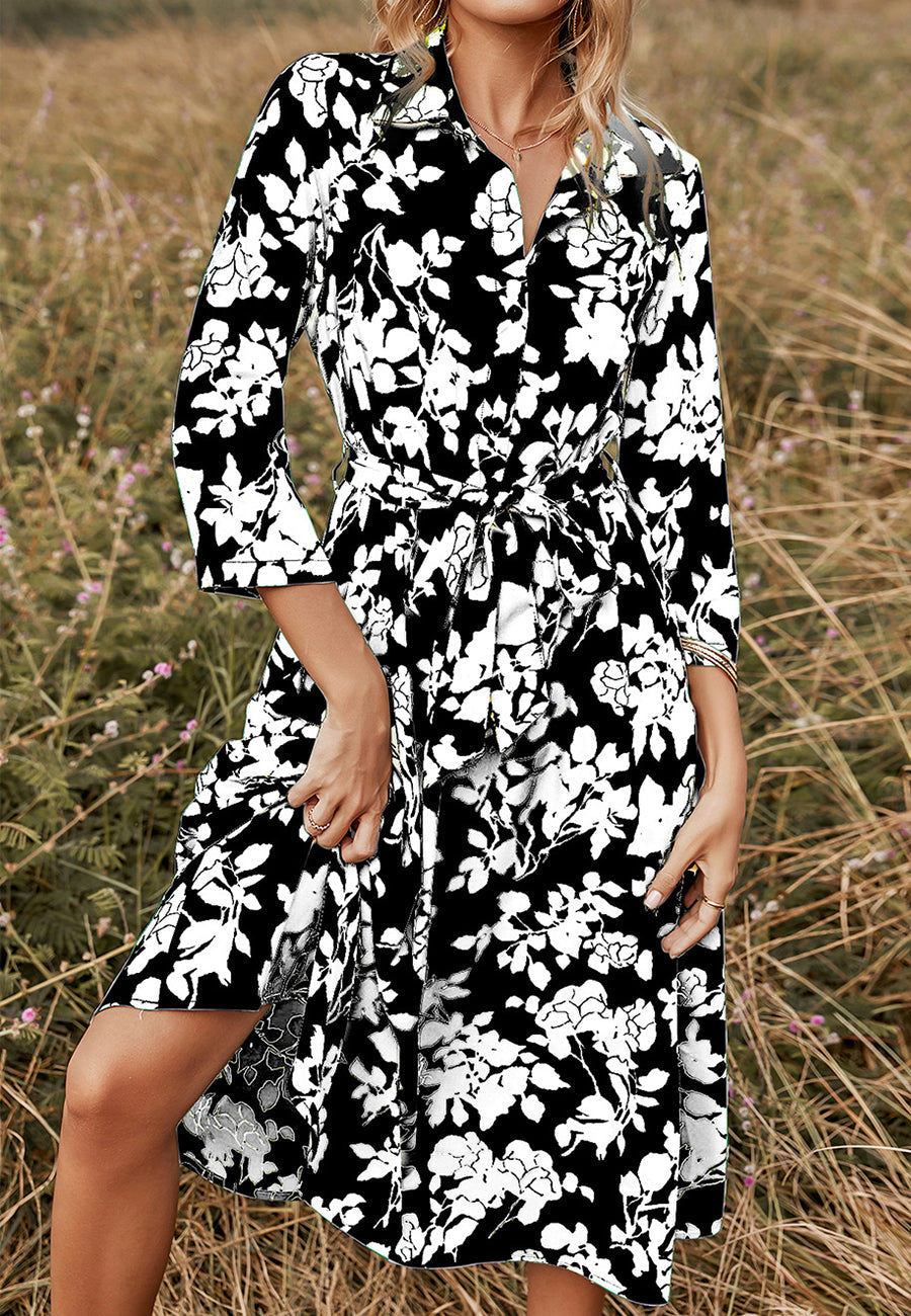 Das Kleid von Emes Shop besticht durch einen glamourösen Blumendruck. Es hat einen Kragen, einen Polo-Stil mit Knopfleiste, lange Ärmel, ein fließendes Kleid und eine Länge bis zur Wade. Kombinieren Sie es mit einem Fedora-Hut und High Heels für einen wunderschönen Look.