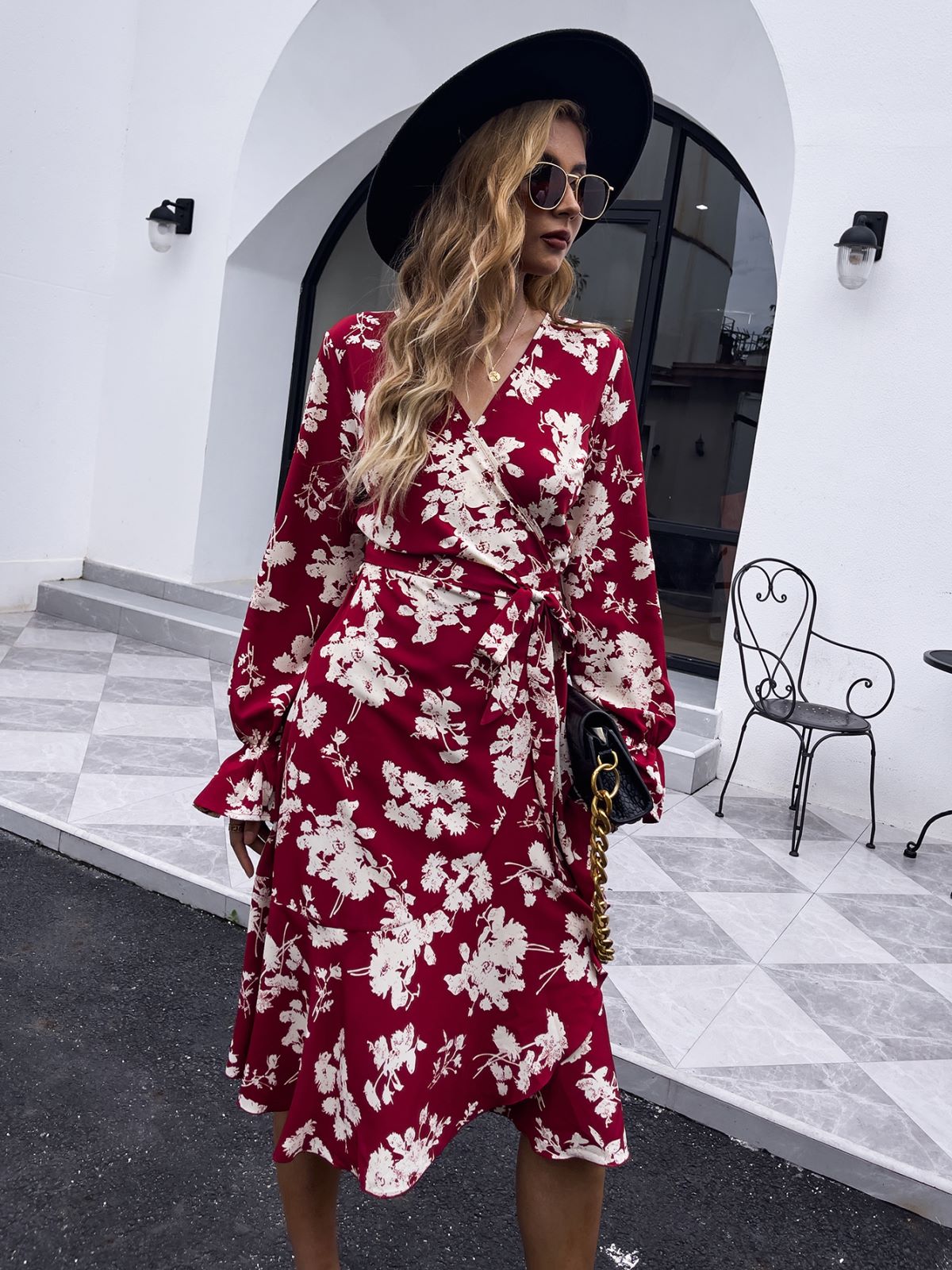 Das Kleid von Emes Shop besticht durch sein sexy Wickeldesign, das garantiert für Aufsehen sorgt. Es hat einen Blumendruck, einen Überwurfkragen, lange Bischofsärmel, eine Taillenschnürung und einen Rüschensaum. Es ist knielang. Kombinieren Sie es mit Riemchen-Pumps und Sonnenbrille für einen wunderschönen Look.