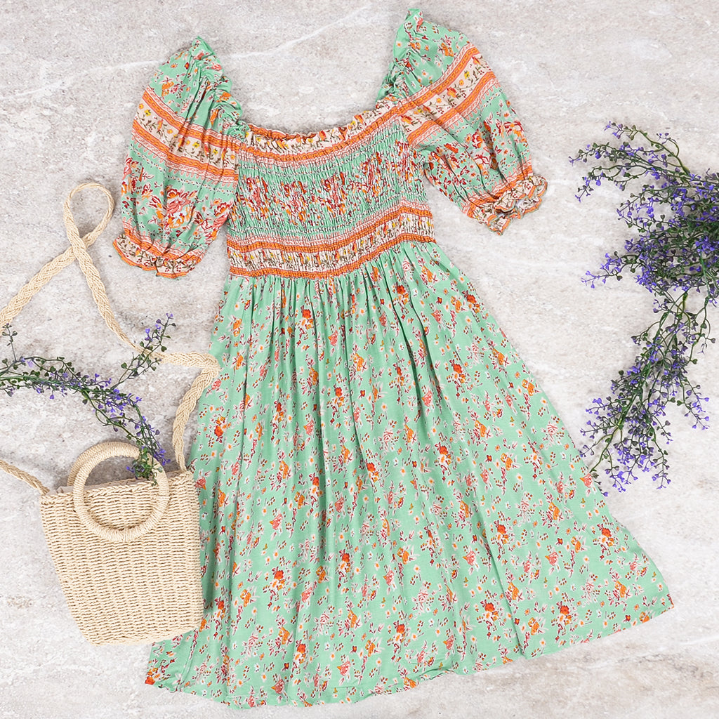 Das Kleid von Emes Shop besticht durch wunderschöne Blumenmuster im Boho-Stil. Es hat einen geraden Ausschnitt, ein gerafftes Oberteil und kurze Puffärmel. Die A-Linien-Silhouette reicht bis übers Knie. Kombinieren Sie es mit einer Holztasche und Gladiatorsandalen für einen atemberaubenden Look.
