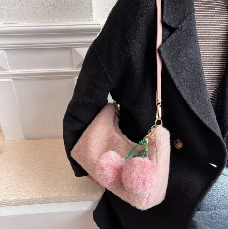 Die Tasche von Emes Shop besteht aus weichem und flauschigem Material . Sie verfügt über einen hängenden Kirschpompon und lange Umhänge-/Schulterriemen.