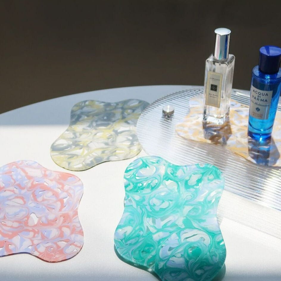 Der Untersetzer von Emes Shop zeigt ein marmoriertes Konfetti-Design auf einem unregelmäßigen Oval. Er besticht durch leuchtende und lebendige Farben und eignet sich als Untersetzer für Getränke oder als dekoratives Tablett für Kerzen, Hautpflegeprodukte, Parfüm usw.