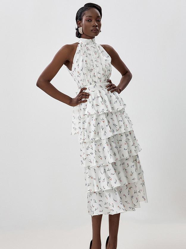 Midi dress made of lightweight material with an exclusive floral print. The bodice of the dress is gathered with small folds, which adds texture and emphasis to the top. The skirt of the dress is multi-layered, with several tiers of frills, creating volume and dynamics. Composition: 100% polyester, lining 97% polyester, 3% elastane