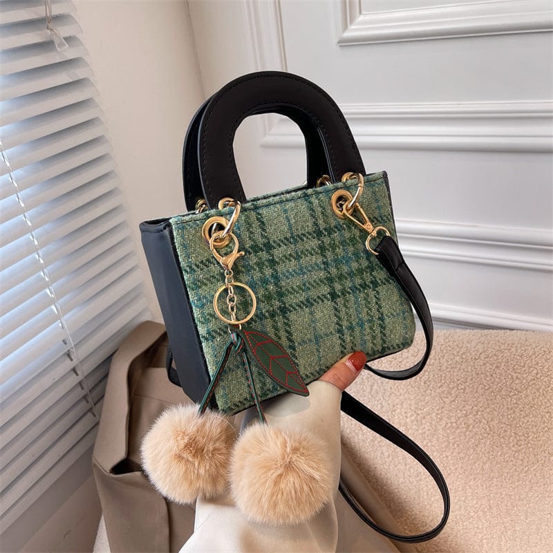 Die EMES SHOP Tasche besticht durch ein kleines, quadratisches Design mit grünem Karomuster oder schwarzem Leopardenmuster. Sie verfügt über einen kleinen Schlüsselanhänger mit Kirschbommel und einen Tragegriff, sodass sie sowohl als Umhängetasche als auch als Handtasche getragen werden kann.