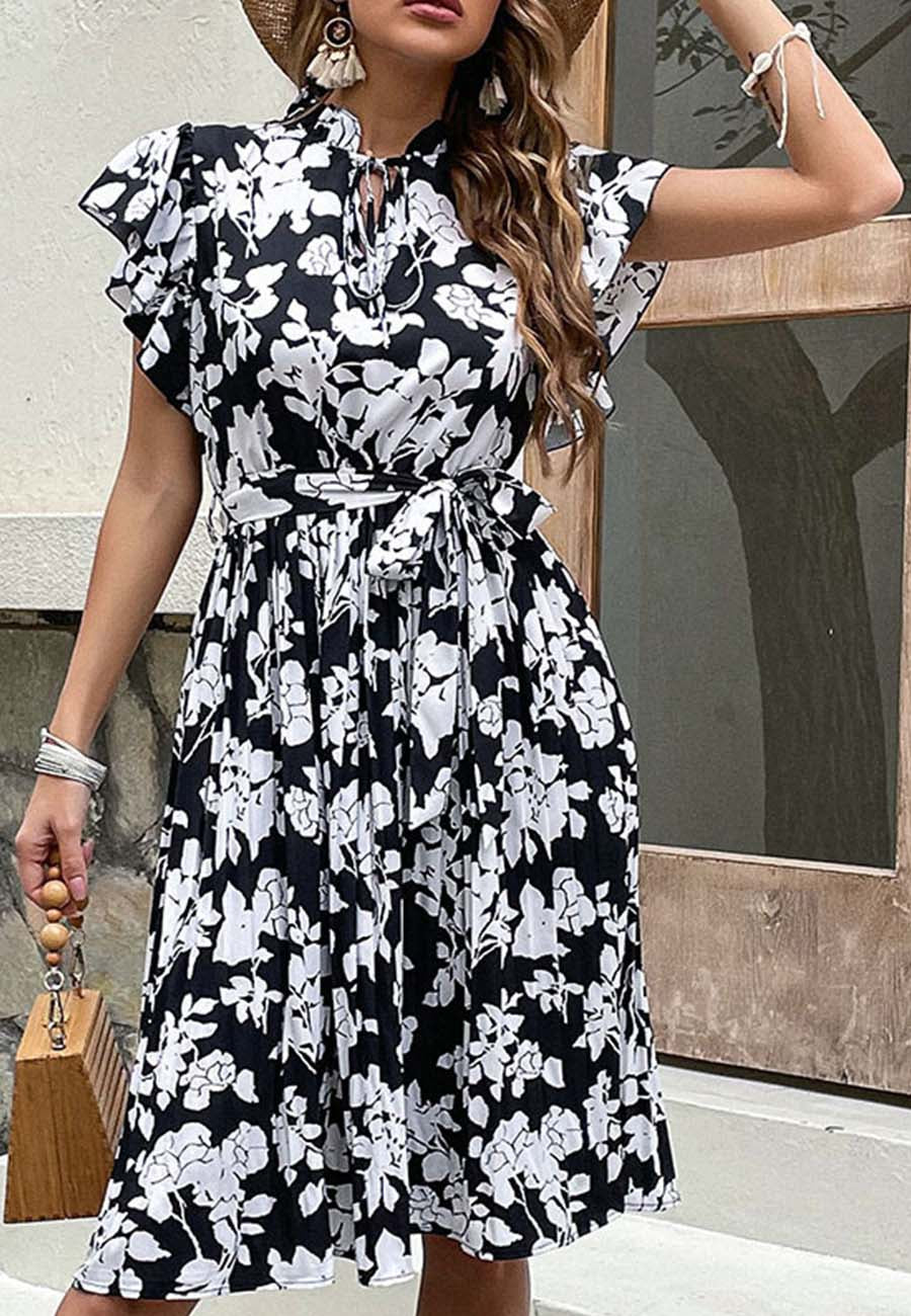 Das Kleid von EMES SHOP besticht durch feminine Rüschenärmel. Es verfügt über einen Bindegürtel am Hals, einen Blumendruck, einen fließenden Rock und ist knielang. Kombinieren Sie es mit einer Handtasche und High Heels für einen klassischen Look.