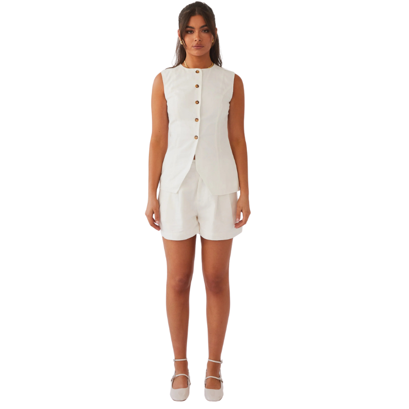 Das zweiteilige Set aus Weste und Shorts vereint strukturierte Schnittführung mit sommerlichem Stil. Es besteht aus einer ärmellosen Weste mit Knopfverschluss und asymmetrischem Saum, kombiniert mit hoch taillierten Shorts. Das Set aus leichtem Stoff präsentiert sich in einem erfrischenden Zitronenton, der Ihrer Garderobe Farbe verleiht. Die strukturierte Silhouette der Weste ergänzt die elegante Passform der Shorts und eignet sich somit für legere Ausflüge, Brunches oder halbformelle Anlässe. Mühelos vielseitig. Es lässt sich wunderbar mit Accessoires für verschiedene Anlässe kombinieren.