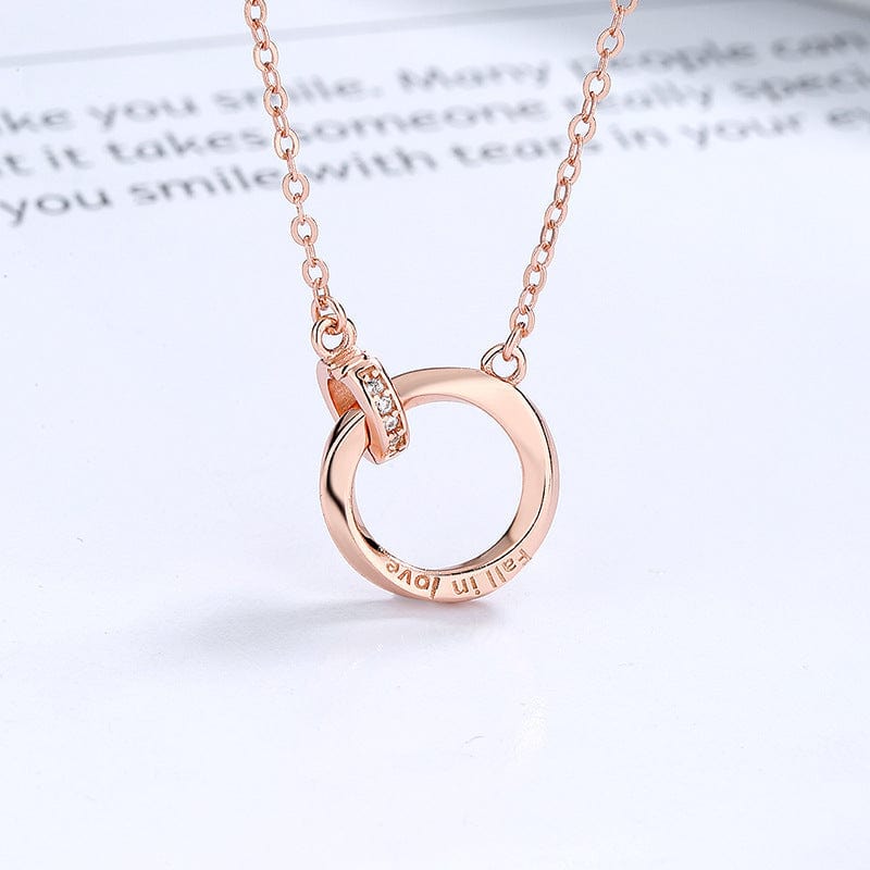 El collar EMES SHOP presenta una joya para parejas a juego con un círculo grande y uno pequeño entrelazados. Está hecho de plata de ley 925, grabado con la palabra "Enamórate" y adornado con pequeños cristales que imitan diamantes.