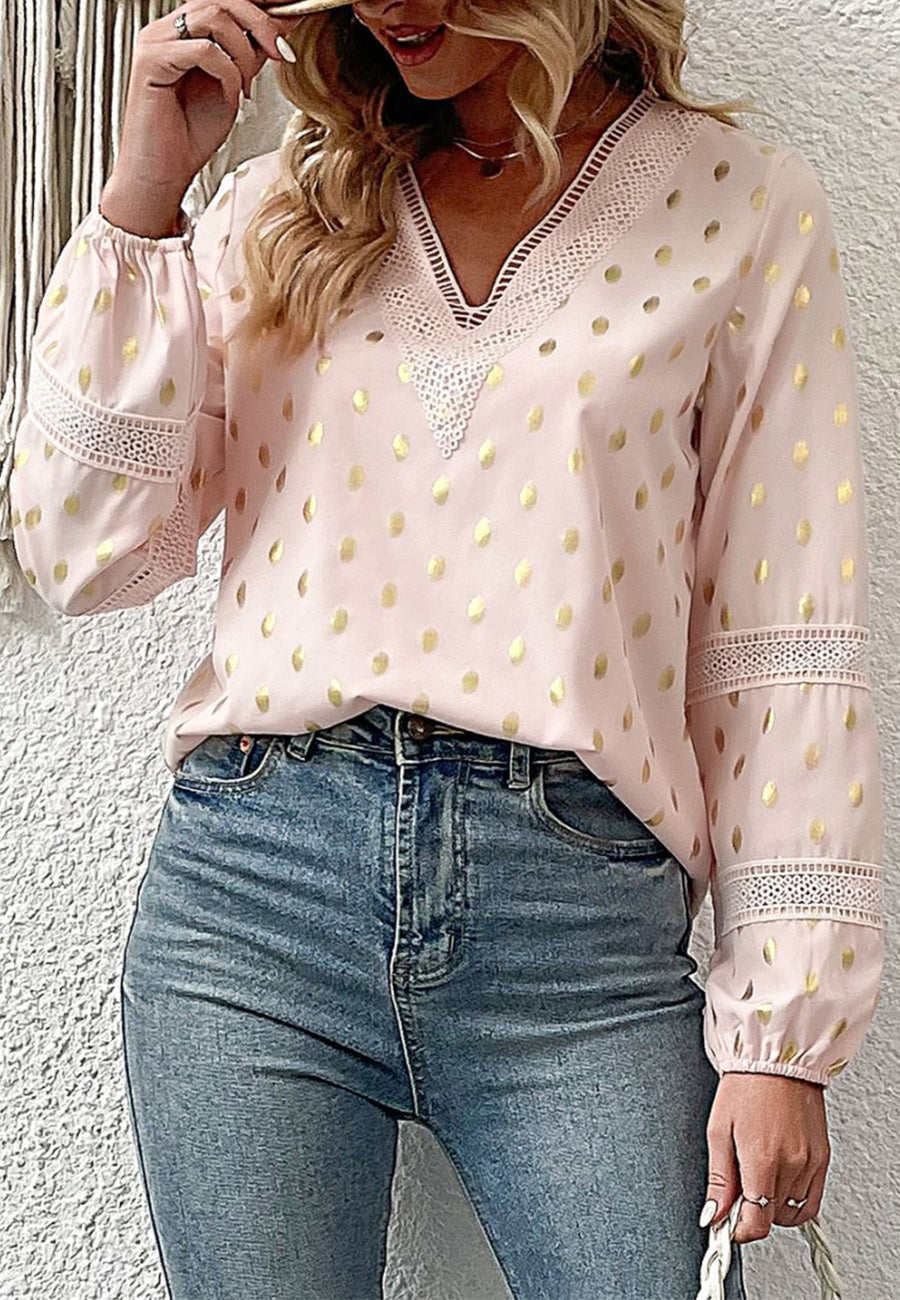 La blusa de EMES SHOP luce un bonito detalle de encaje de crochet. Tiene escote en V, estampado de lunares, mangas largas y corte regular. Combínala con vaqueros deshilachados y un bolso para un look fabuloso.