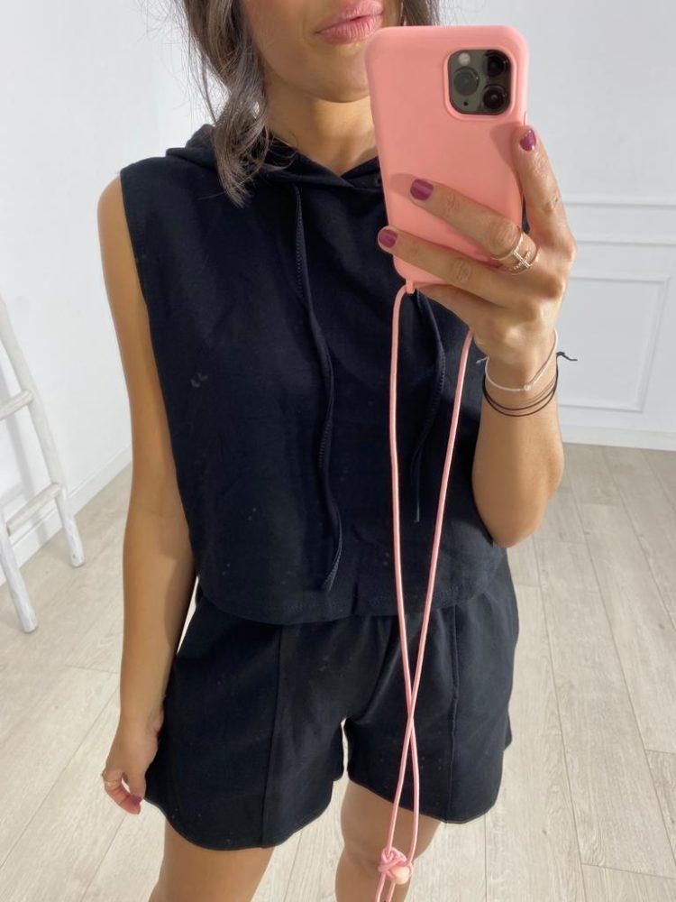 ¡Por fin un conjunto ultrasuave y cómodo para relajarse! Incluye un top corto con capucha, un corte oversize y sisa baja. Los pantalones cortos tienen una cómoda cinturilla elástica y el largo perfecto para relajarse.