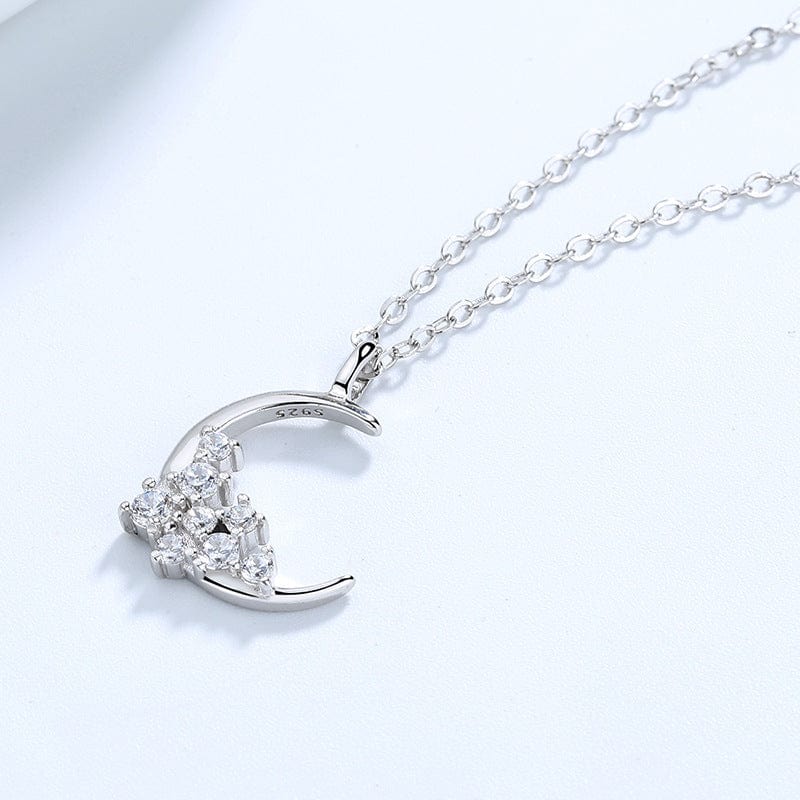 El collar de EMES SHOP luce una media luna creciente, sencilla y elegante a la vez. Está hecho de plata de ley 925 y adornado con pequeños cristales que imitan diamantes.