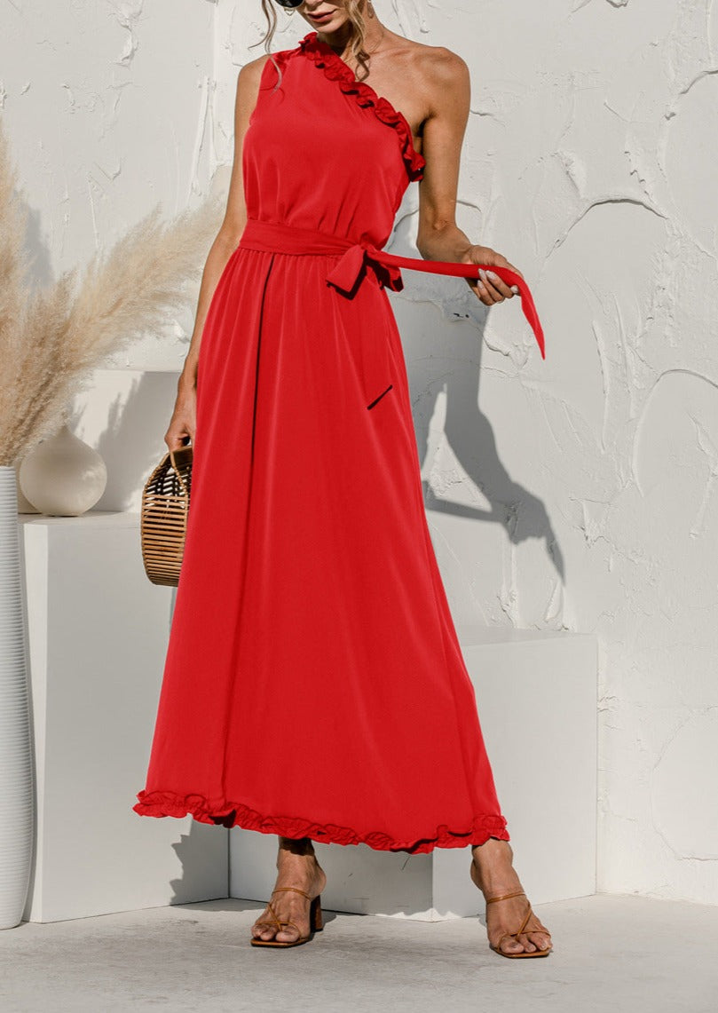 El vestido largo para una cita nocturna de EMES SHOP luce un diseño de un solo hombro con volantes en el ribete y el bajo, y cintura con lazo lateral. El largo llega hasta los tobillos. Está confeccionado en 100 % poliéster suave, ligero y transpirable, ideal para usar a diario en días soleados. Combínalo fácilmente con tus tacones favoritos, un cinturón a juego y un clutch de verano.