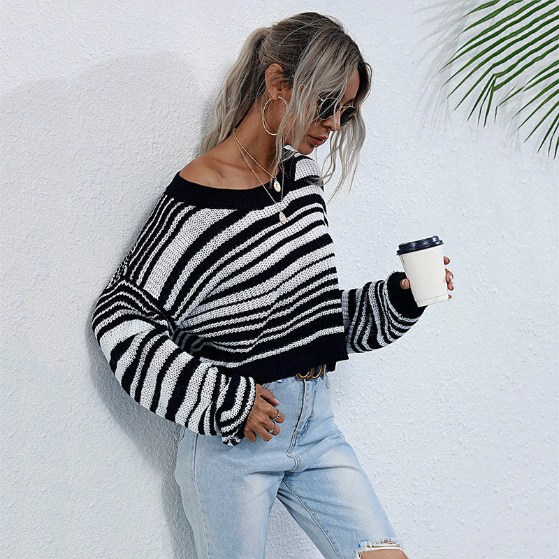 El suéter EMES SHOP luce un llamativo estampado de rayas que resulta muy atractivo. Tiene cuello redondo, hombros caídos, mangas largas, tejido de punto y un corte holgado. Combínalo con vaqueros desgastados y botines para un look informal esta temporada.