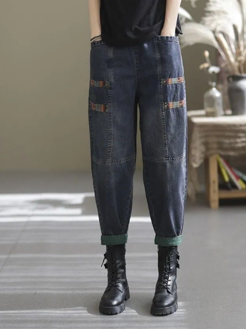 Estos pantalones harén con parches sueltos están hechos de mezclilla y son de color azul. La cintura es holgada, así que puedes ajustarlos a tu cuerpo. Miden 86 cm (33,8 pulgadas), lo que los hace perfectos para usar con tacones o zapatillas deportivas. También están disponibles en tallas S, M y L, ¡así que elige la que mejor te quede!