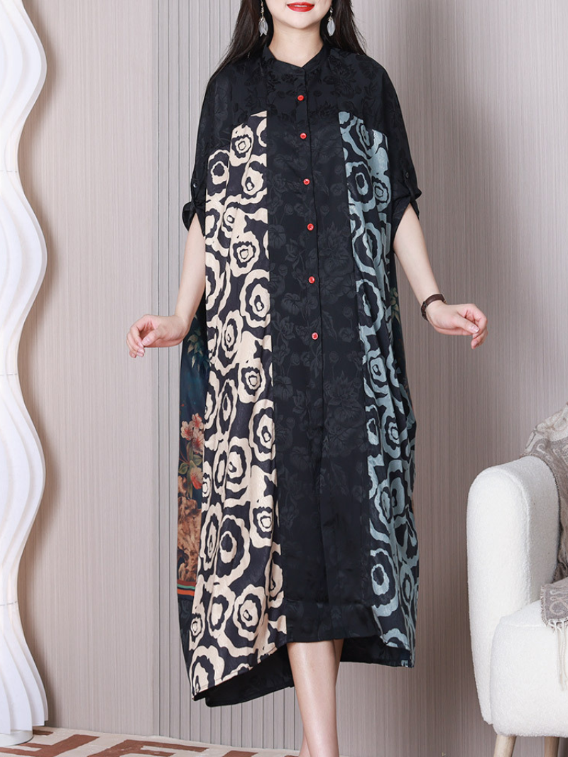 Este vestido negro de seda de corte A está hecho de seda de alta calidad, suave y lujoso al tacto. La blusa es 85% seda, lo que proporciona un ajuste cómodo y transpirable. El cuello alto le da un toque de elegancia y sofisticación. Su estilo retro la hace perfecta para quienes aman la moda vintage. Su hermoso estampado floral le da un toque de feminidad y gracia. Esta blusa de seda negra es perfecta para ocasiones formales o informales. Se puede combinar con pantalones de vestir o falda para un look más formal, o con jeans para un look más casual. Esta versátil blusa es imprescindible en cualquier armario y es perfecta para añadir un toque de glamour y sofisticación a cualquier outfit.