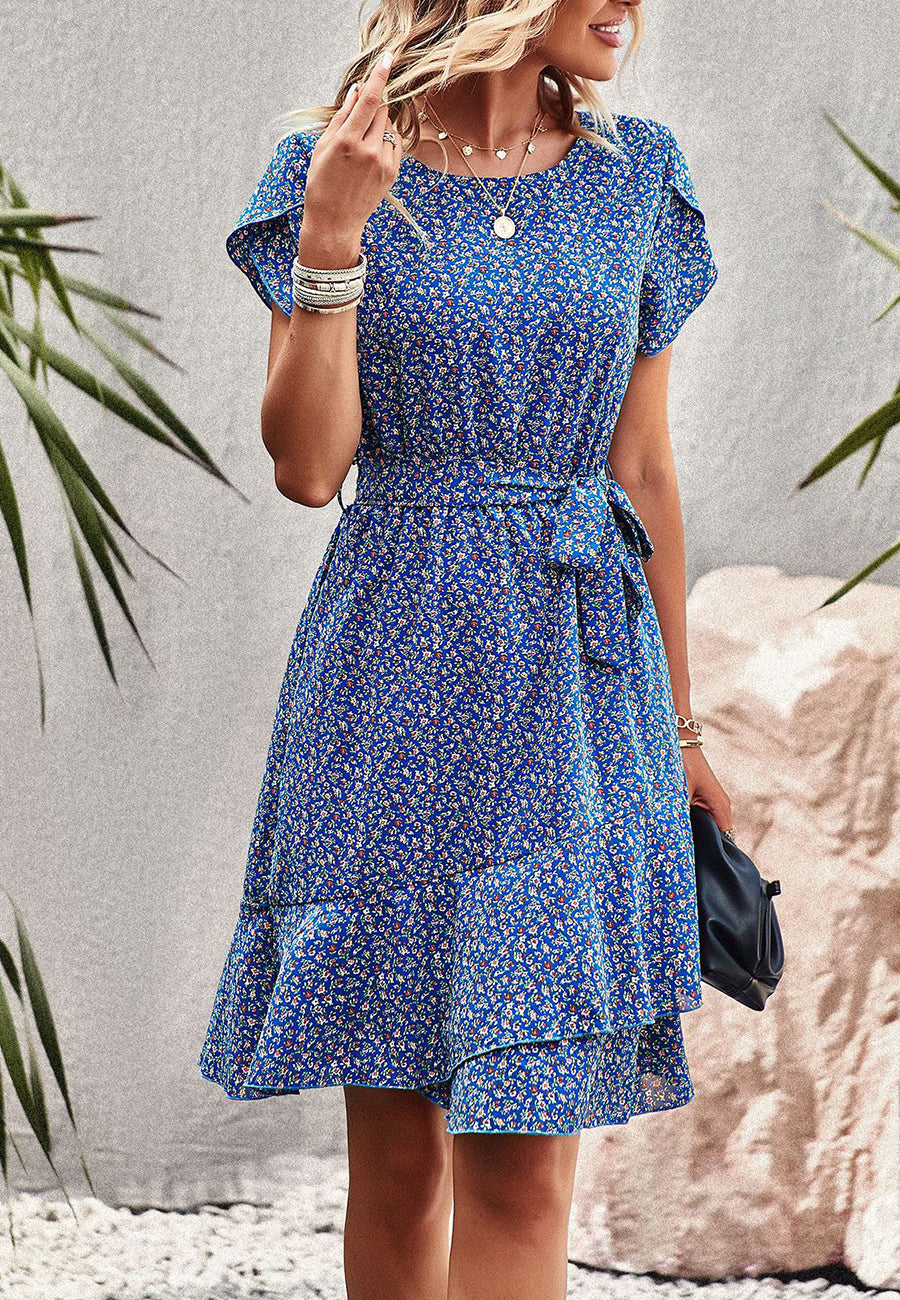 El vestido de Emes Shop luce un elegante volante asimétrico en el bajo. Luce un estampado floral, cuello redondo, mangas tulipán, lazo en la cintura, falda vaporosa y largo por encima de la rodilla. Combínalo con un collar y sandalias para un look espectacular.
