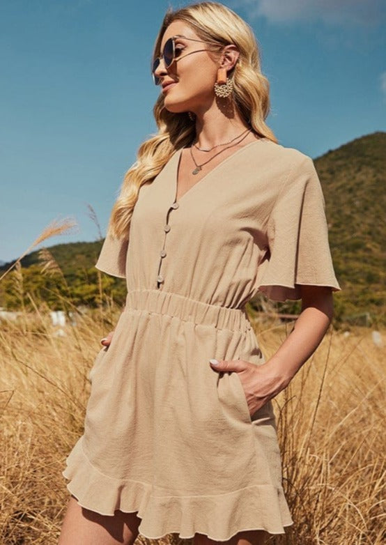 El mono Emes Shop luce una femenina manga con volante. Tiene escote en V, botones, bolsillos inclinados, color liso, bajo con volante y corte regular. Combínalo con gafas de sol y botas para un look fantástico.