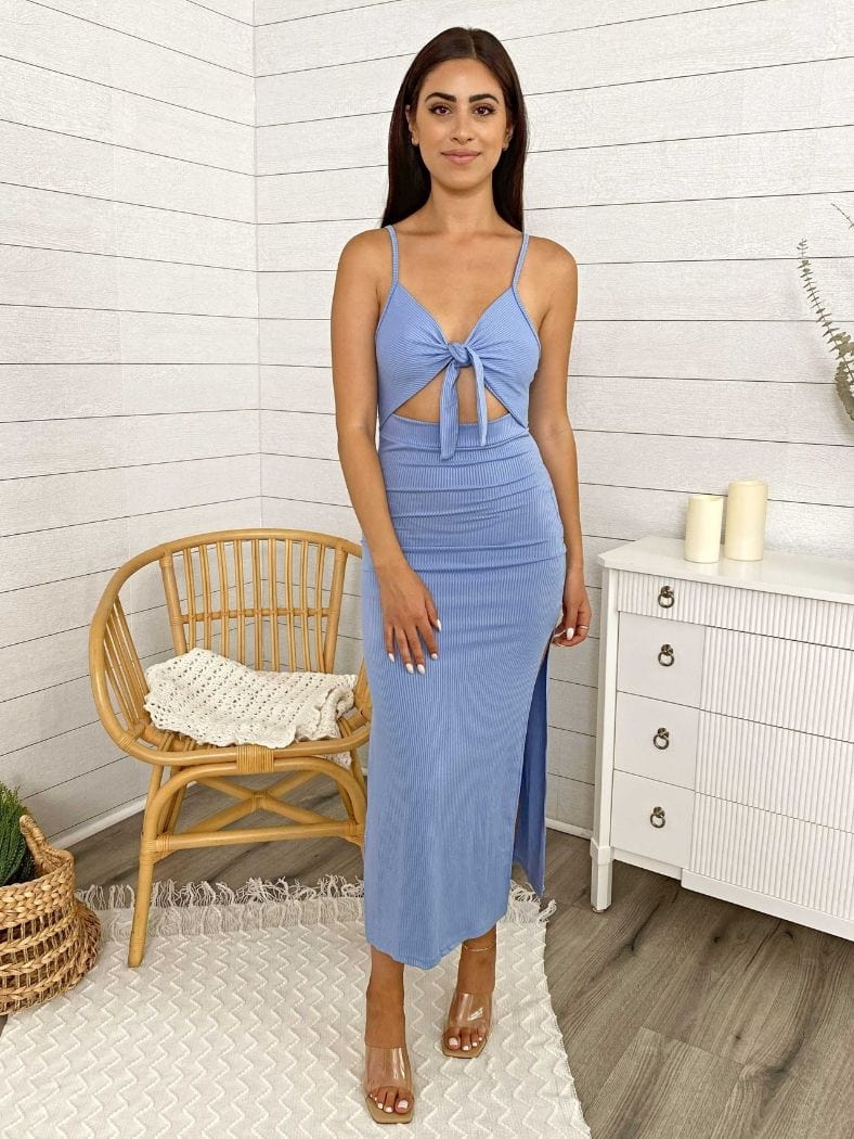 El vestido acanalado de Bloom es la prenda perfecta para esta temporada. Este vestido de punto acanalado elástico presenta un nudo frontal para mayor sujeción, un corpiño sin mangas y un corte ajustado. ¡Combínalo con tus tacones de tiras favoritos para un look fabuloso!