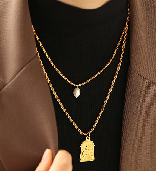 El collar de Emes Shop luce una cadena de oro retorcida y un colgante de perla natural auténtica o de oro repujado. Combina con un look moderno.