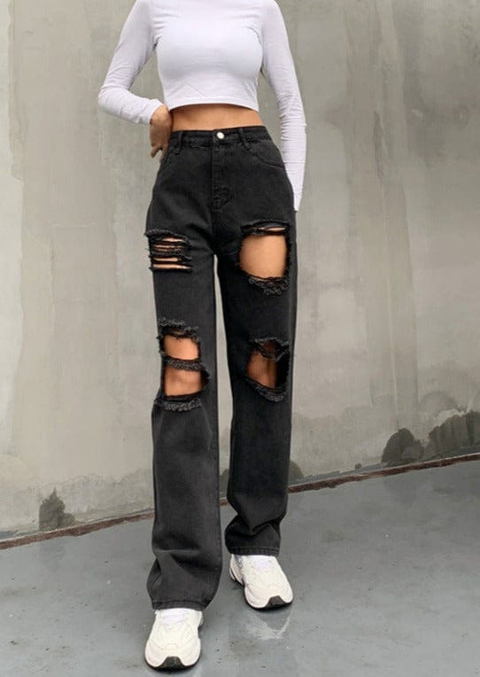 Los jeans de mezclilla de EMES SHOP tienen tiro alto y un corte holgado, recto, ajustado y relajado. Presentan grandes agujeros y detalles desgastados en muslos y rodillas. Estos jeans cómodos y modernos son perfectos para una salida con amigos. Completa el look con un top tipo corsé y zapatillas deportivas.