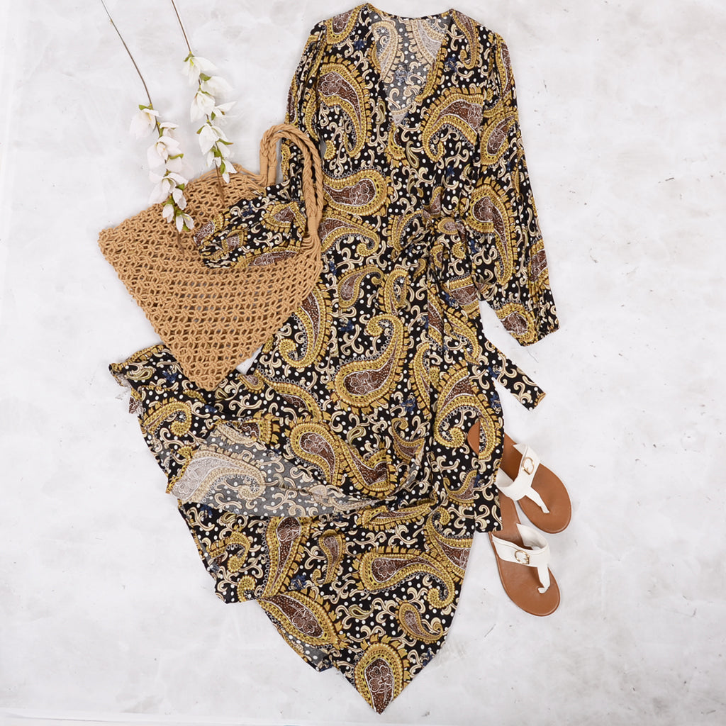 Este vestido luce un clásico estampado bohemio de cachemira y una abertura en la pierna que facilita el movimiento y deja ver la pierna perfecta. Tiene mangas largas, largo hasta el tobillo y escote en V. Confeccionado en 100 % rayón suave, ligero y transpirable, ideal para usar a diario en días soleados. Un vestido formal que queda genial solo con tacones.