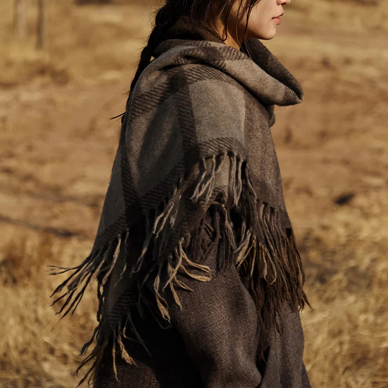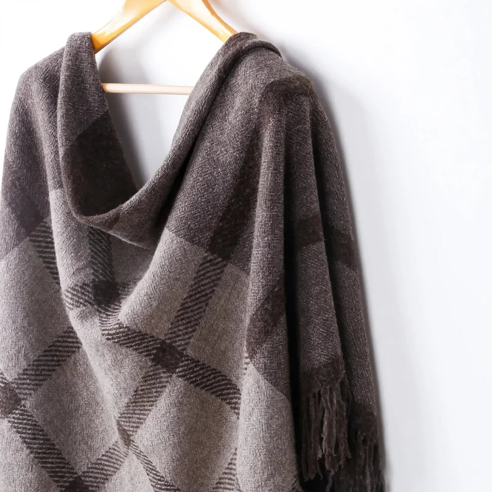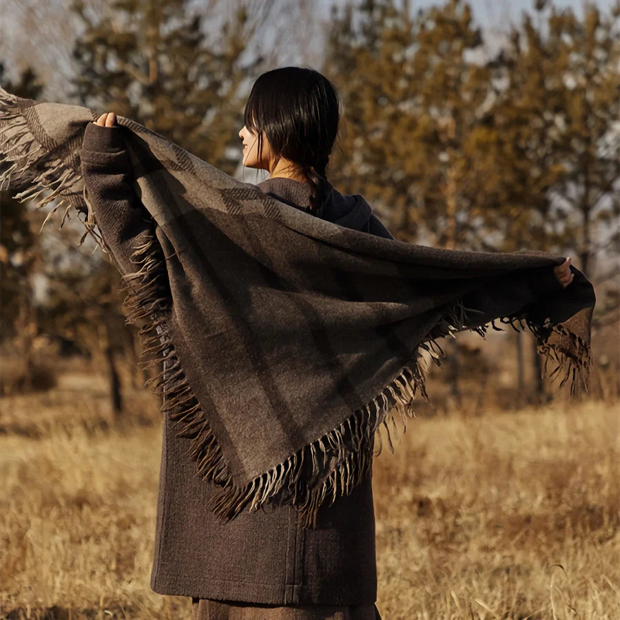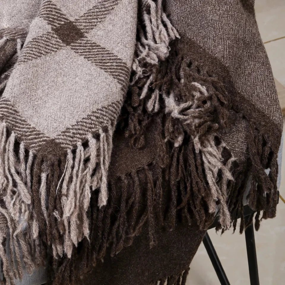 Esta bufanda es más que un simple accesorio; es una pieza que marca tendencia y combina moda y funcionalidad. Su diseño geométrico a cuadros en relajantes tonos beige café le da un toque sofisticado que complementa a la perfección cualquier atuendo. Con más de 175 cm de largo, ofrece una amplia cobertura, lo que permite usarla como chal, manta o bufanda tradicional. Las borlas hechas a mano le dan un toque de encanto artesanal, haciendo que cada pieza sea única y especial.