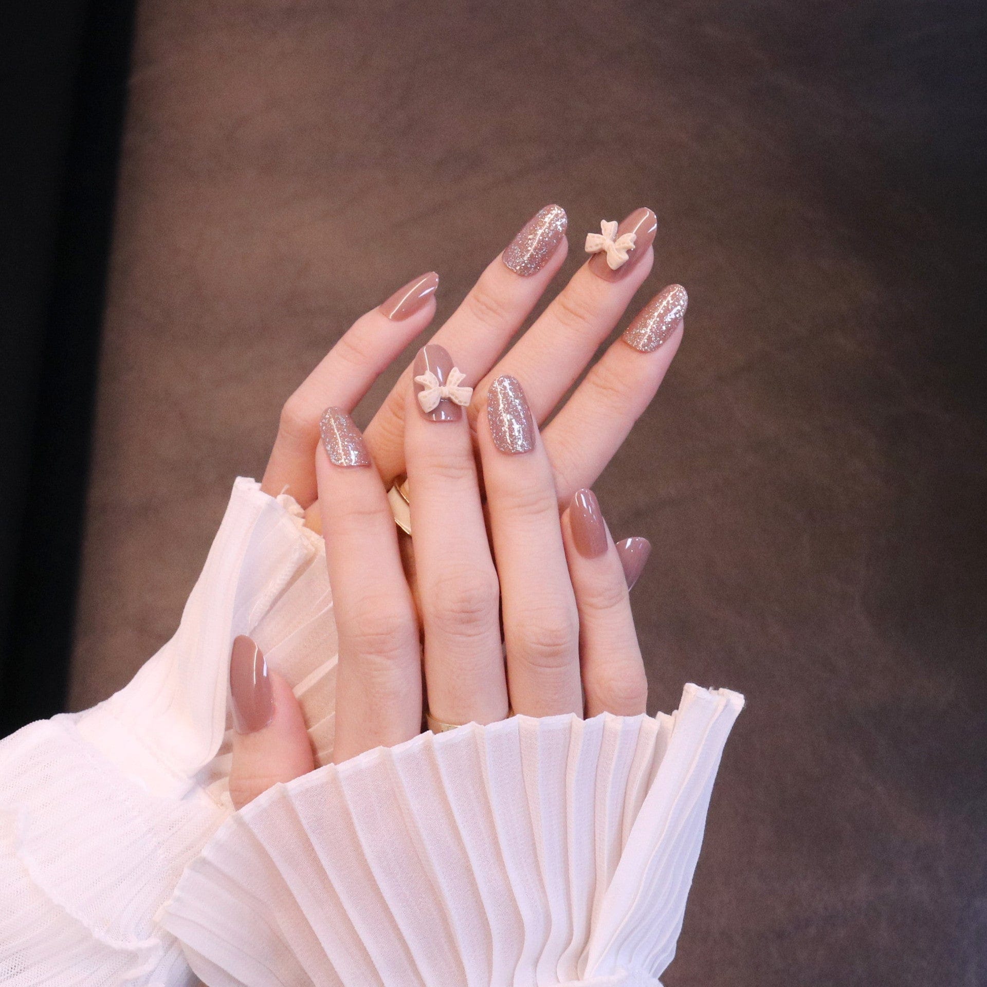 Las uñas postizas de The Emes Shop tienen detalles en marrón claro y brillantina. Incluyen un lazo 3D que realza el diseño.