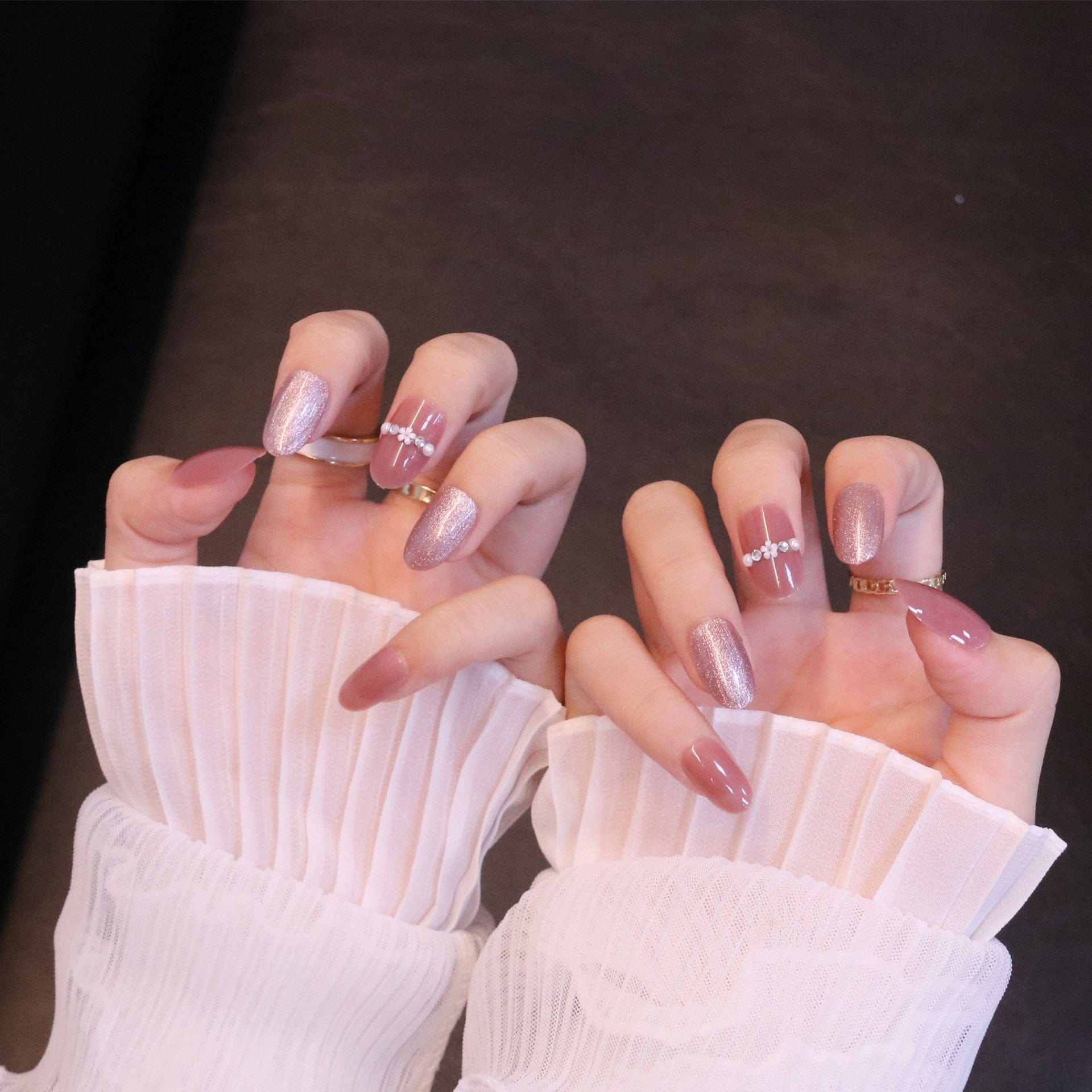 Las uñas postizas de The Emes Shop presentan un diseño de punta redonda en un tono rosa brillante. Presentan una hilera de perlas y cristales con efecto diamante .