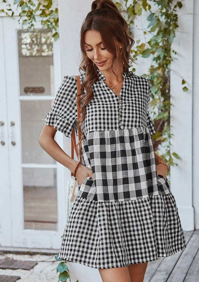 El vestido de Emes Shop luce un clásico estampado de cuadros vichy. Tiene cuello, botones en contraste y volantes en los hombros. Mangas 3/4. Vestido escalonado. Corte recto y largo por encima de la rodilla. Combínalo con un clutch y tacones para un look fabuloso esta temporada.