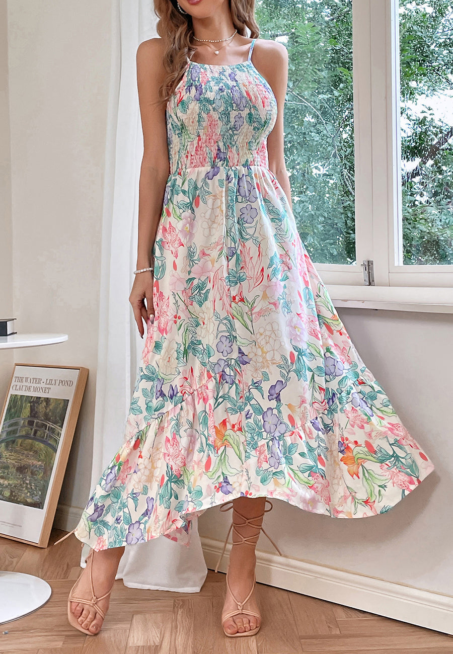 El vestido de Emes Shop luce un precioso estampado floral multicolor. Presenta escote halter, corpiño fruncido, falda vaporosa, bajo con volante y largo hasta media pantorrilla. Combínalo con accesorios delicados y tacones de aguja para un look sofisticado.