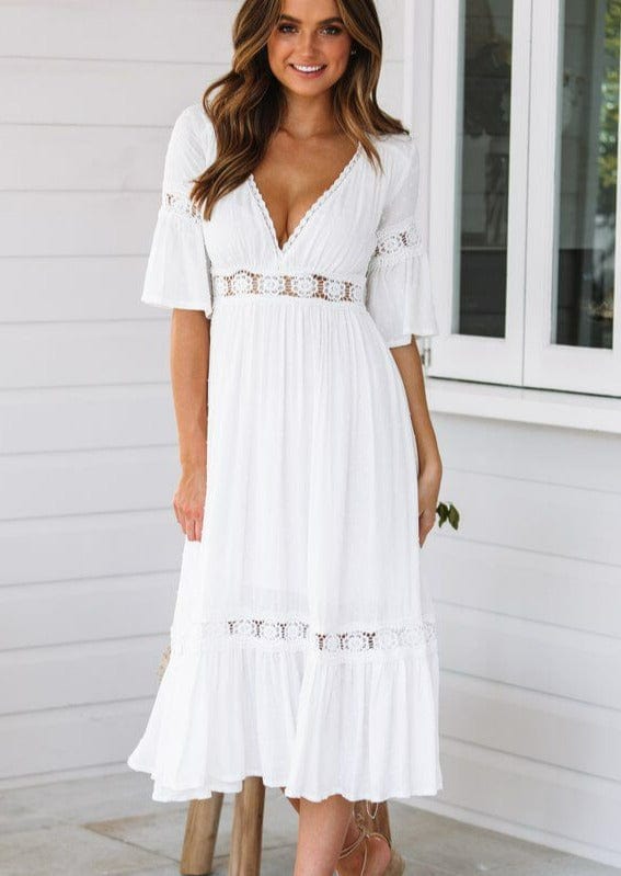 El vestido de Emes Shop luce un precioso encaje de crochet. Presenta un escote pronunciado, mangas cortas acampanadas y largo por debajo de la rodilla. Combínalo con alpargatas y un bolso de paja para un look veraniego espectacular.
