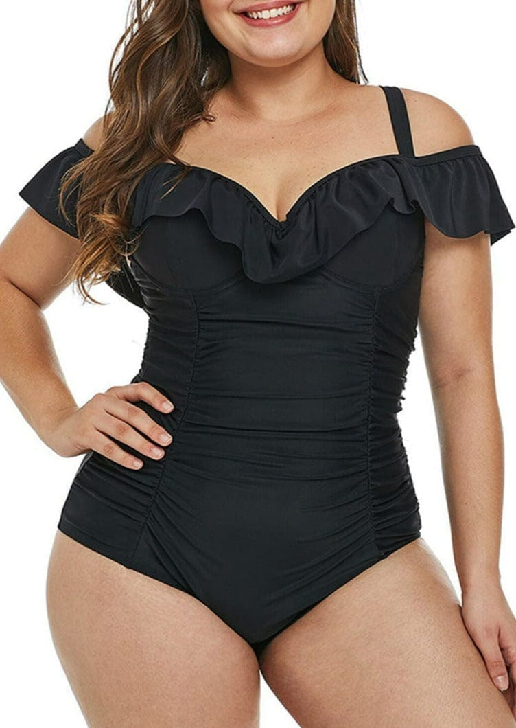 El traje de baño entero de Emes Shop luce un escote corazón con volantes y hombros descubiertos, tirantes gruesos y ajustables que se cruzan en la espalda, detalles fruncidos laterales y una braguita de cobertura completa. Este elegante y clásico traje de baño es perfecto para un relajante día de playa.