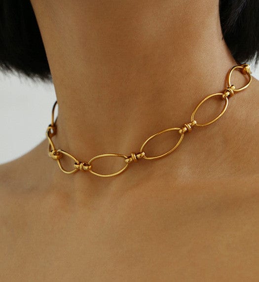 El collar de Emes Shop presenta una cadena de estilo retro con eslabones geométricos huecos. Presenta un engaste dorado y se coloca justo encima de la clavícula a modo de gargantilla.