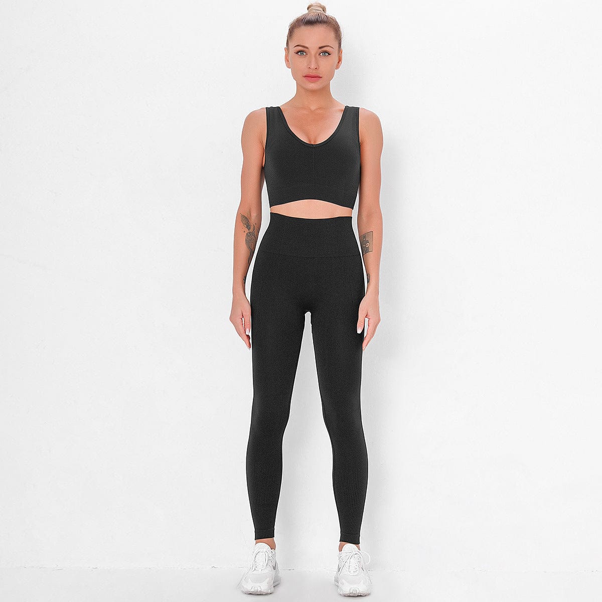 El conjunto de dos piezas de Emes Shop incluye top y braguita acanalados. El sujetador deportivo presenta una banda más gruesa para mayor sujeción, escote en V y espalda redondeada y escotada. Los leggings son de cintura alta con una cinturilla gruesa que se ajusta perfectamente.