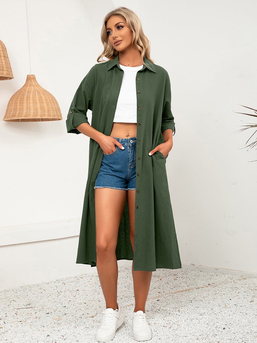 El vestido camisero EMES SHOP luce un clásico color liso que evoca la naturaleza y la tierra. Tiene cuello, cierre de botones, mangas largas ajustables, aberturas laterales y bolsillos laterales. Corte recto y largo por debajo de la rodilla. Combínalo con zapatillas blancas y gafas de sol para un look informal de día.