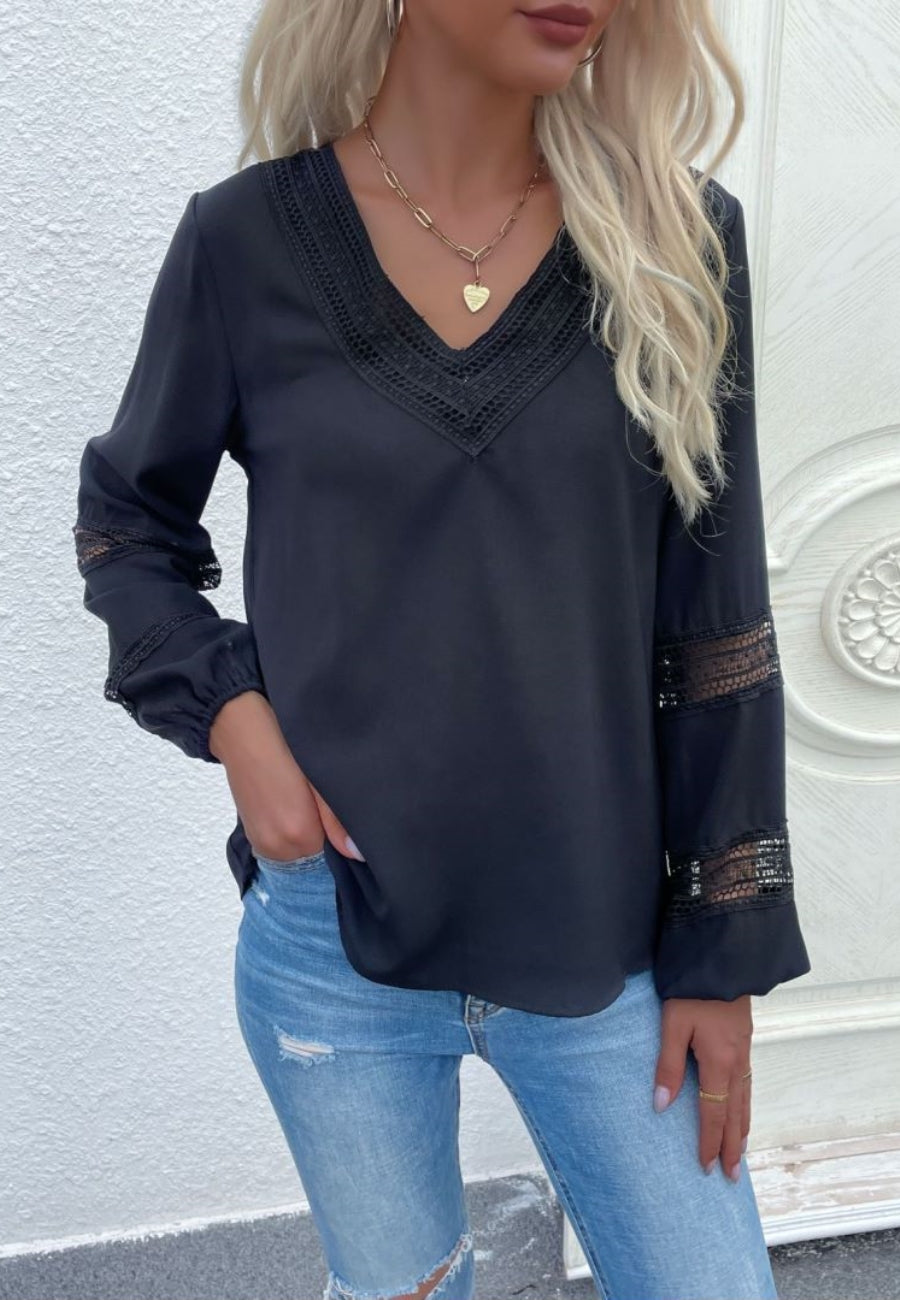 La blusa de EMES SHOP luce un delicado encaje de crochet. Es de color liso, con escote en V, mangas largas y corte regular. Combínala con jeans desgastados y botas para un look espectacular.
