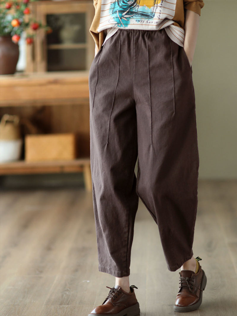 Pantalones Harem Casuales de Algodón con Cintura Elástica para Mujer, Color Sólido y Sueltos. Estos pantalones están hechos 100 % de algodón y cuentan con un elástico en la cintura. Son perfectos para quienes buscan un estilo elegante y cómodo. Disponibles en negro, café oscuro, caqui claro y caqui oscuro.