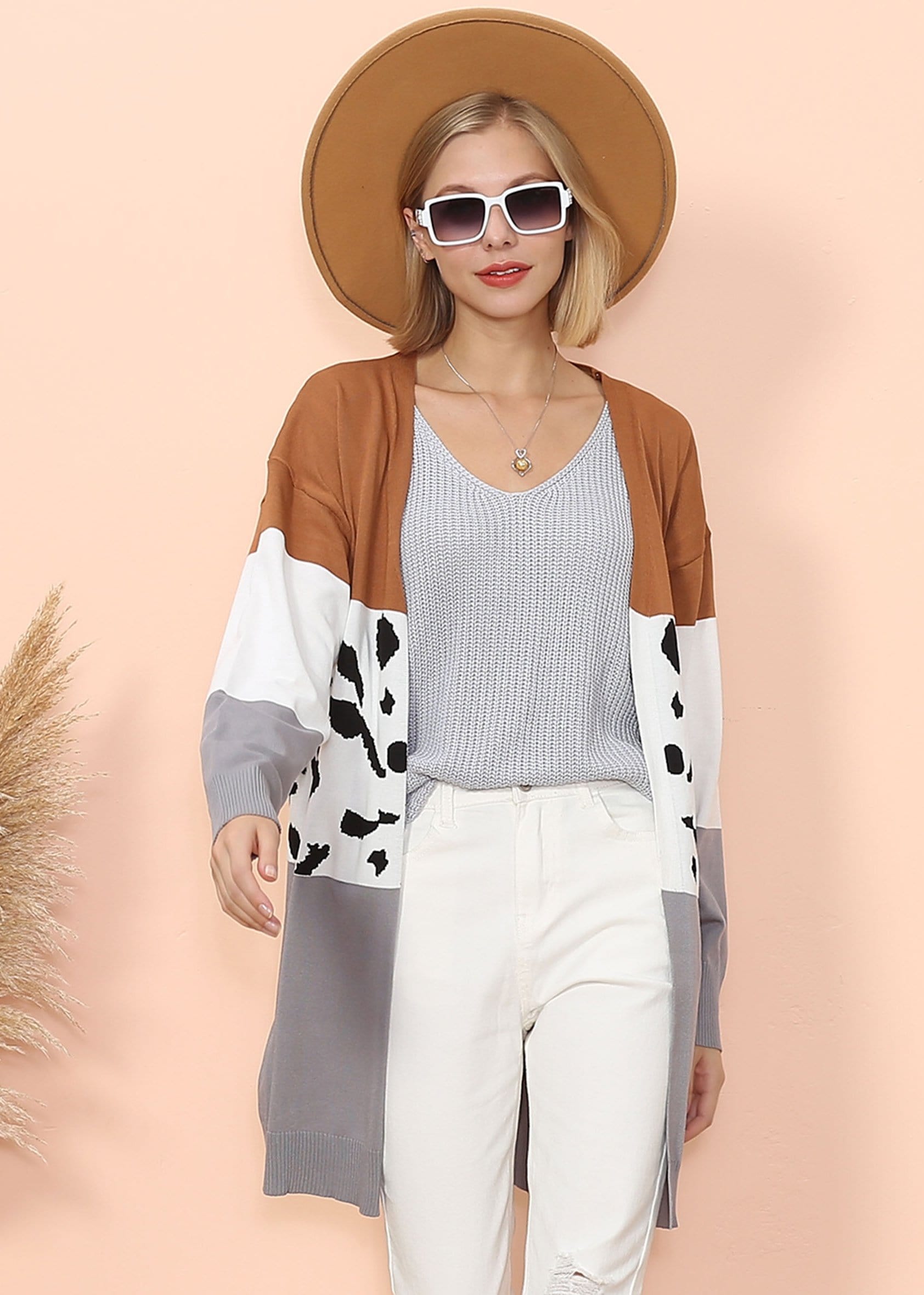 The EMES SHOP cardigan is detailed with a unique color block design that mixes animal prints and solid colors. Features an open front. long sleeves. drop shoulder. ribbed trims. long length. and regular fit. Layer it over a sweater dress for a cozy look.