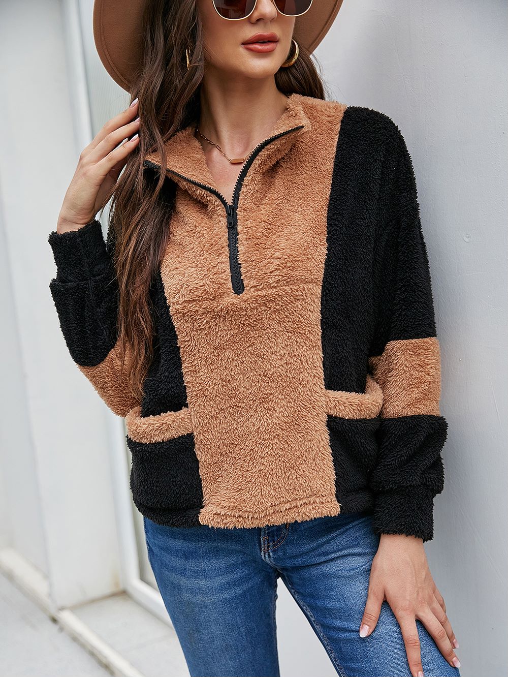 The EMES SHOP sweater is detailed with a bold color block design featuring a teddy fur texture material. Features a zip up detail. long sleeves. front pockets. and relaxed fit. Pair it with ripped jeans and boots for a beautiful look.