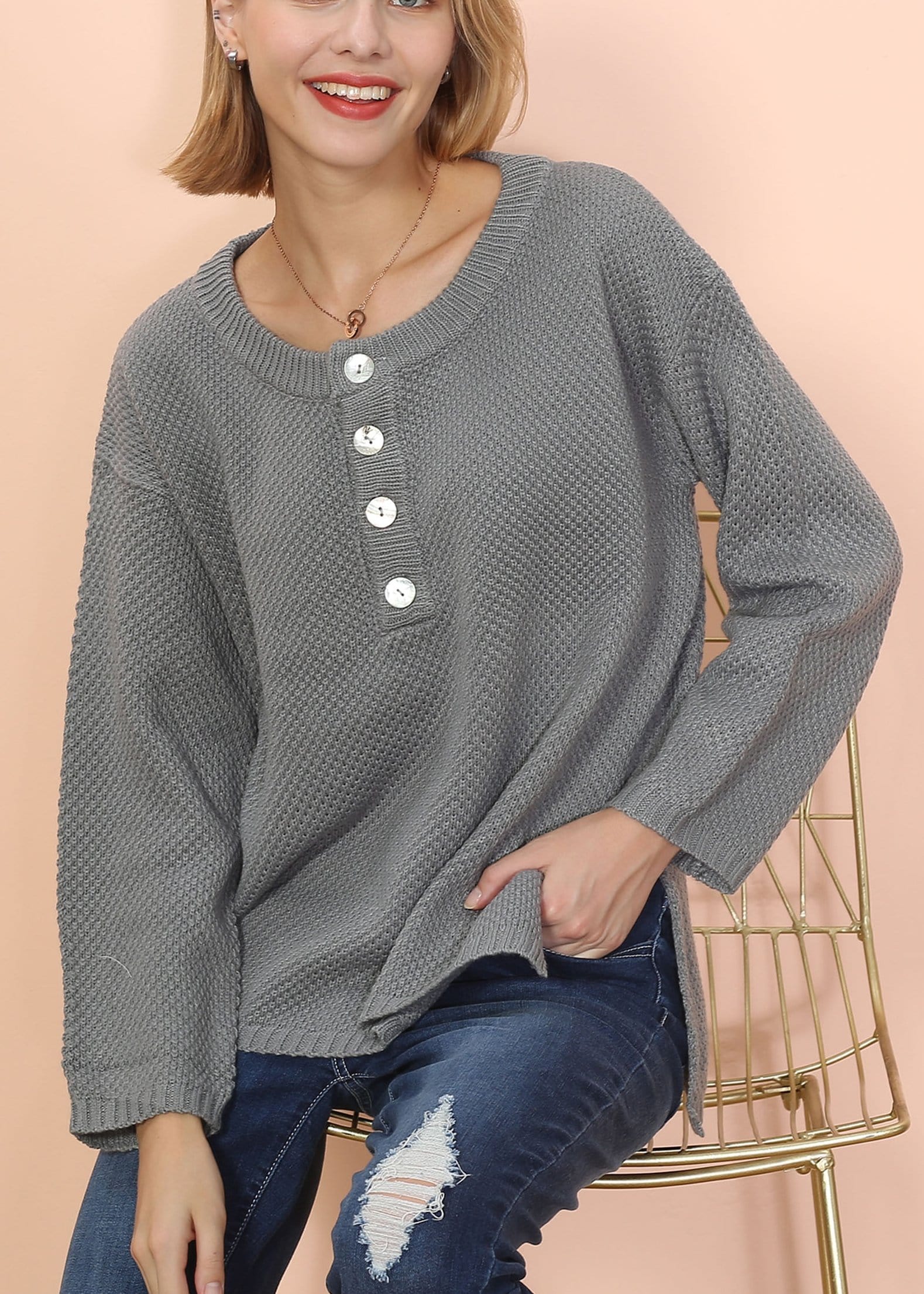 The EMES SHOP sweater is detailed with a cute contrast half button down front detail. Features a round neck line. long sleeves. textured knit. and oversized fit. Pair it with wide-leg jeans and sneakers for a casual outdoor look.