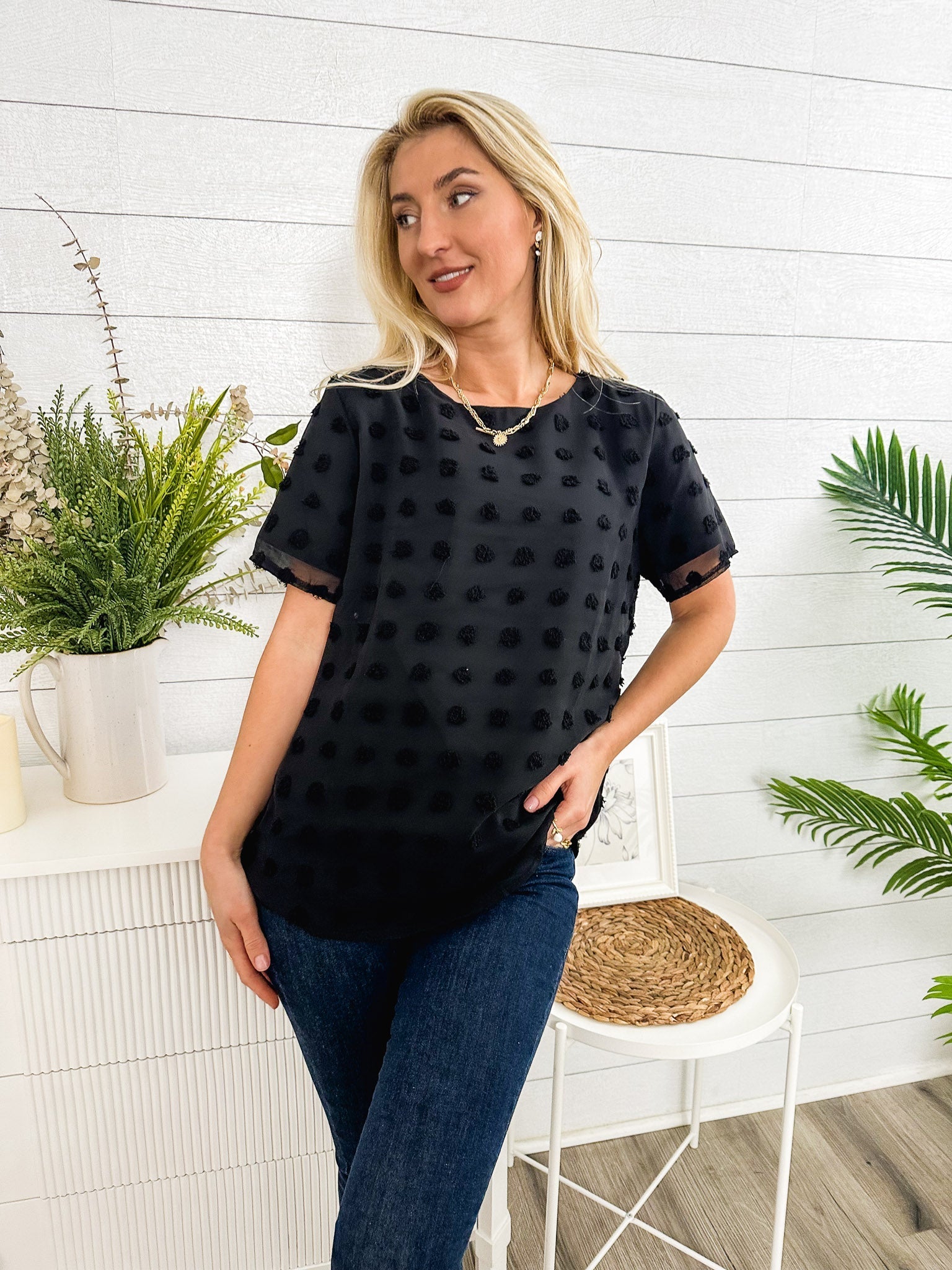 This clip dot chiffon blouse makes for an incredibly chic and easy outfit. Pair this chiffon blouse with your favorite denim shorts and sandals to dress down or dress up with a pair of pants.