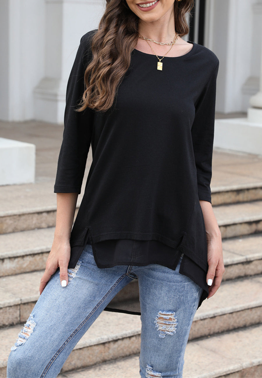 The Emes Shop top is detailed with a fantastic double hem design. Features a round neck line. solid color. three quarter flared sleeves. and loose fit. Pair it with your favorite jeans and sneakers for a beautiful look.