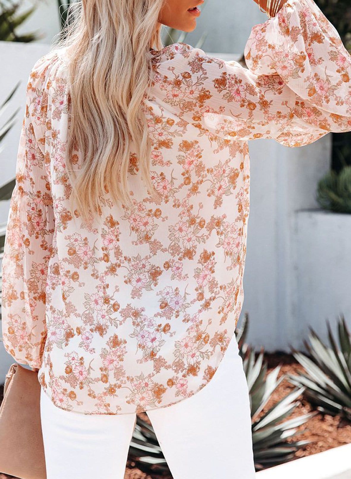 The Emes Shop blouse is detailed with a vintage floral print. Features a v neck line. long sleeves. rounded hem. and flowy fit. Pair it with white trousers and sandals for a dainty spring look.