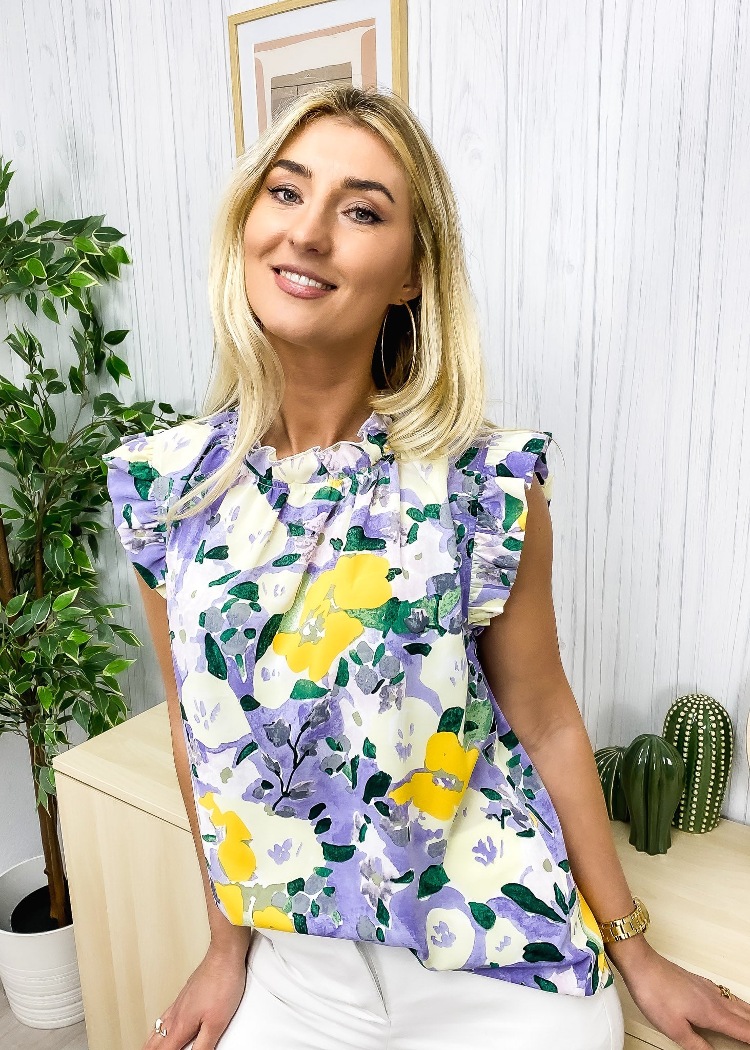 The Emes Shop blouse is detailed with a beautiful floral print. Features a ruffle neck. ruffle shoulder detail. and flowy fit. Pair it with denim jeans and sandals for a lovely look.