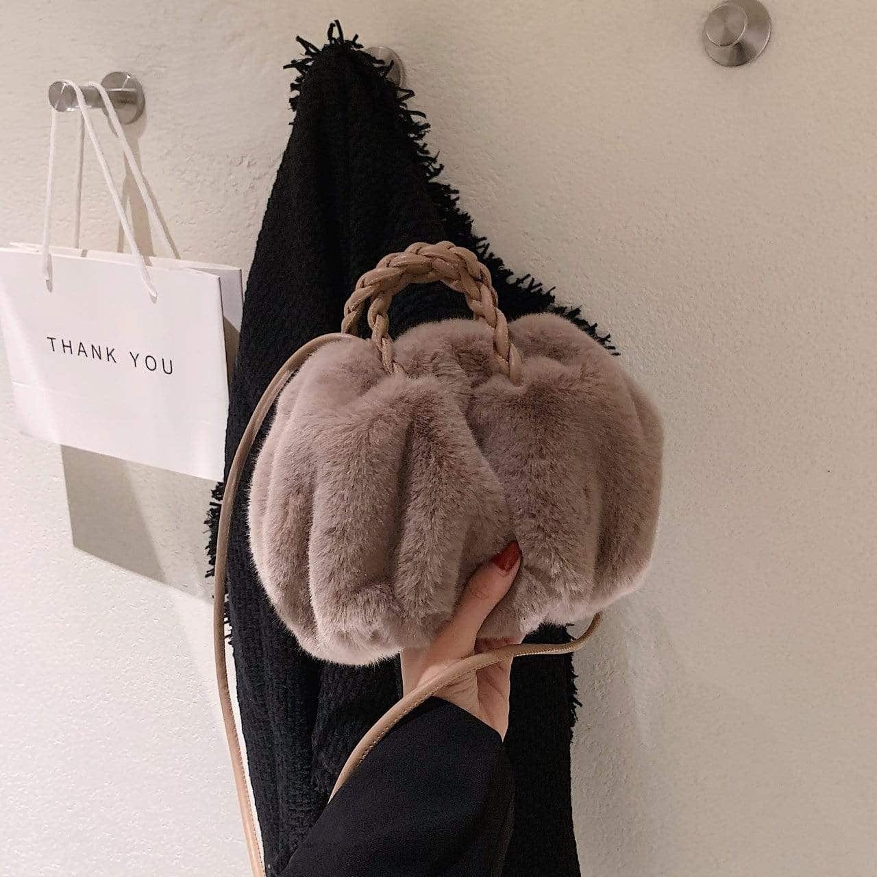 The Emes Shop bag is detailed with a cute fluffy material. Features a braided handle. thin long straps. and a round design.