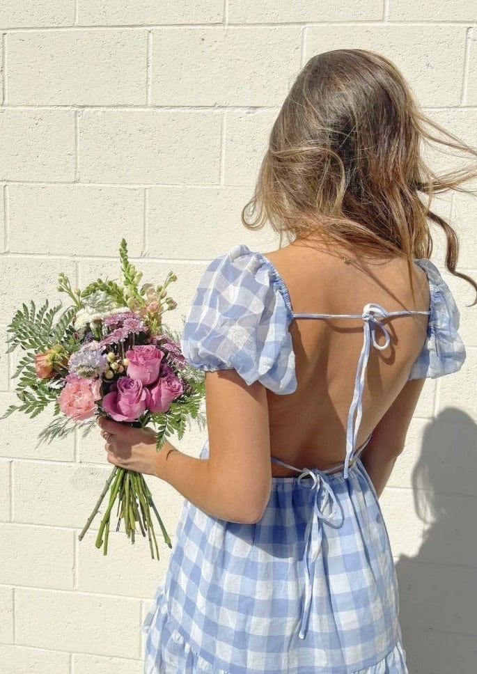 The Emes Shop dress is detailed with a slight v ineckline. lace trim. and puffed short sleeves. Features an open tying back. and ruffled skirt hem that falls at a mini length. Pair this perfect summer dress with a pair of western boots for a chic look.