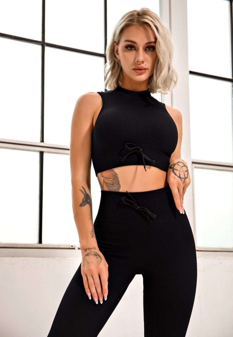 The EMES SHOP two piece set details a halter sports bra and leggings made of a soft and stretchy material. The sleeveless sports bra details an semi tied front design. The high waist leggings and top featured a unique textured pattern that adds style and comfort.