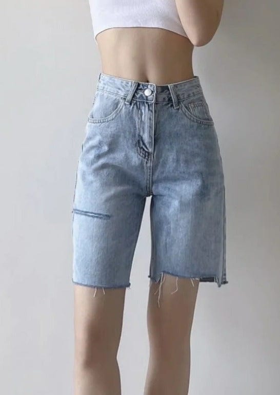 The EMES SHOP denim jeans are detailed with a high-waisted rise. and are mid-thigh length. Features an upper thigh slit. raw hem. and distressed back pocket. Feature an overall loosed relaxed fit. and light blue denim wash. These comfy and chic denim shorts are perfect for a summer day under the sun. Finish off the look with a cropped tank and tennis shoes for a casual chic look.